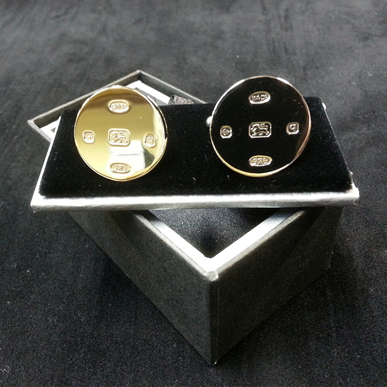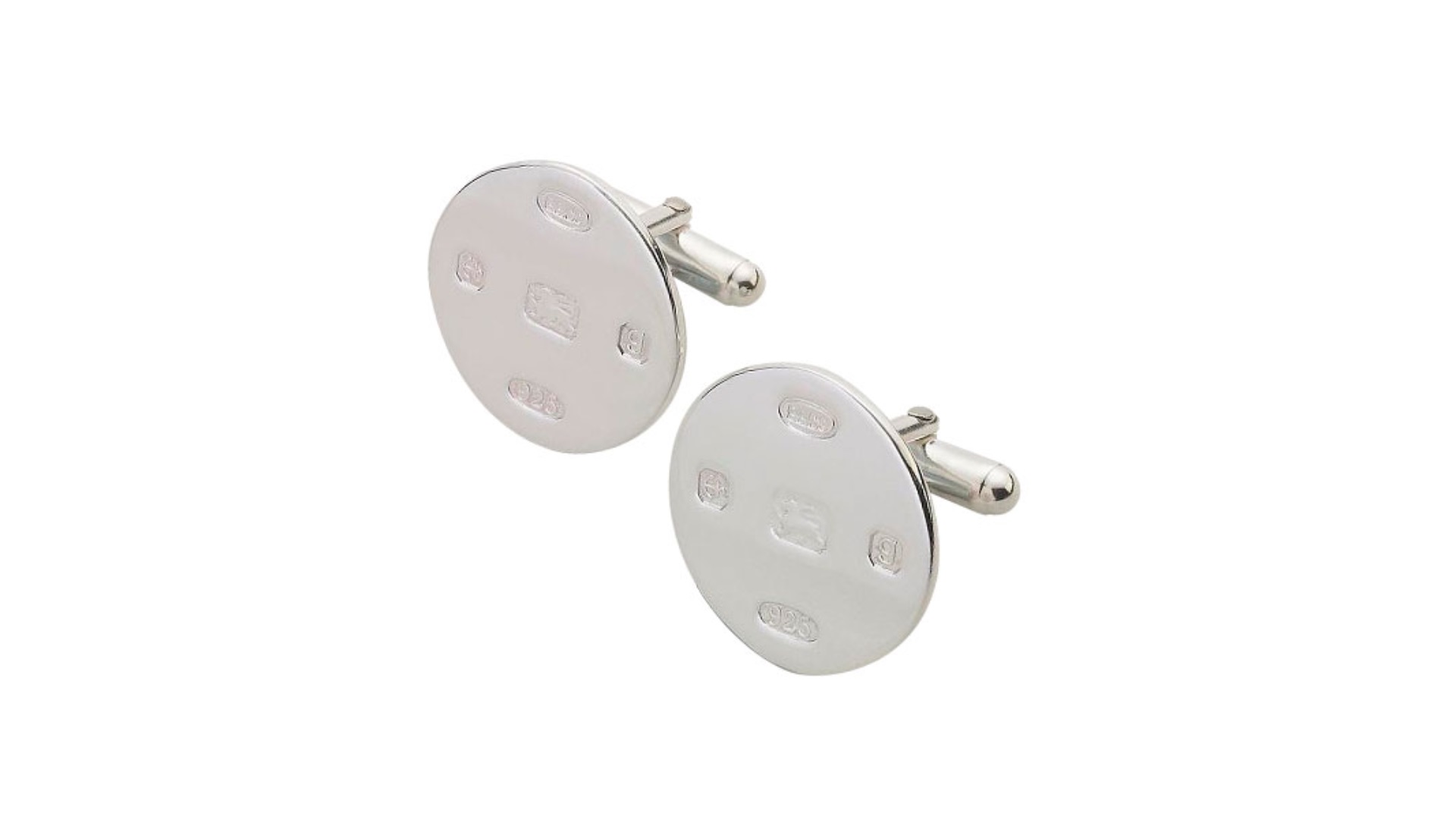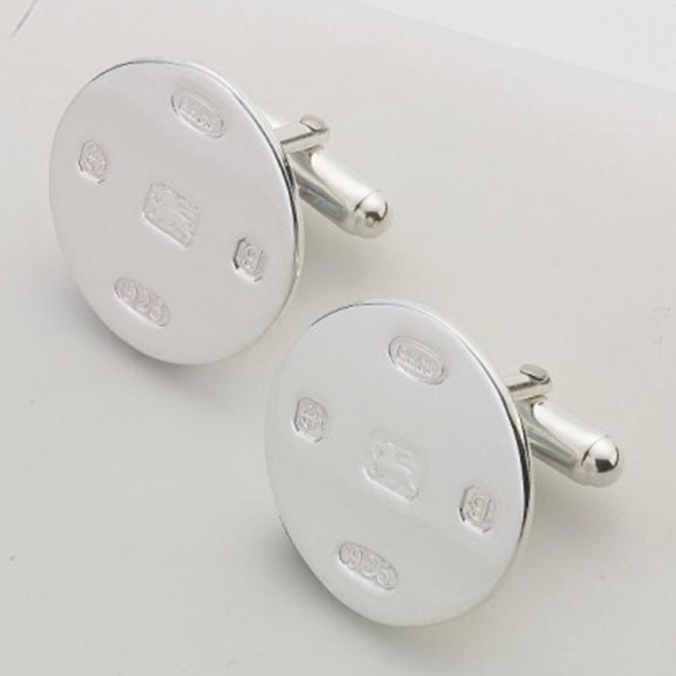 Round sterling silver hallmarked cufflinks featuring a large hallmark. Supplied in an attractive presentation box.